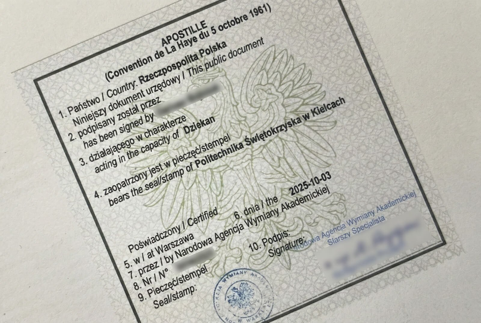 Apostille (Convention de La Haye du 5 octobre 1961), co oznacza: Zgodnie z Konwencją Haską z dnia 5 października 1961 roku. Trzeba podkreślić, że Apostille nie potwierdza autentyczności tłumaczenia, a potwierdza autentyczność pieczęci, podpisu oraz funkcję osoby podpisującej.